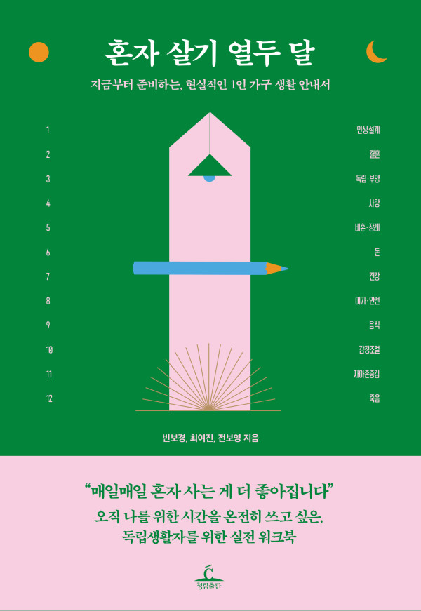 이 책은 일 년 열두 달을 알차게 보내고 싶은 1인 가구를 위한 생활의 노하우를 담았다. 단단한 인생 계획, 결혼과 비혼에 대한 문제, 난처한 질문에 대처하는 법, 건강한 생활 습관, 자신을 이해하는 시간 등등 꼼꼼하고 세심한 정보들로 가득 채웠다. 건강하고 행복한 ‘나 홀로 라이프’는 이루어진다! 지금부터 진정한 독립생활을 시작해보자.